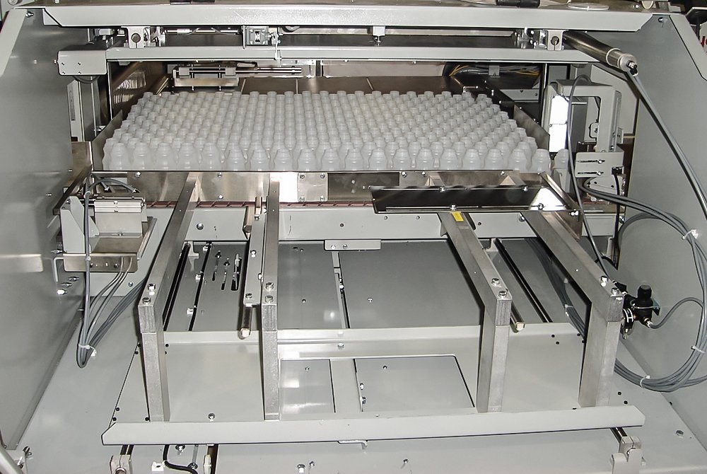 Containers convey or gravity feed into Dyco’s Model 3710 Automatic Bottle Bagging machine to begin the bagging process. The bottles form rectangular arrays and then push into the film for sealing. Once the complete bundle forms, a servo-driven stacker picks up the bundle and gently places it in the stack location.