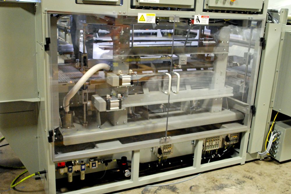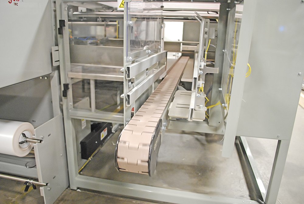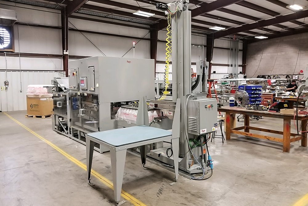 Dyco’s Model 3722 Automatic Bottle Bagging machine provides a row-forming infeed pick and place system that consistently achieves speeds of more than 200 containers per minute. Its vacuum-capable infeed and row-forming area ensure container and array stability. The arrays are pushed into a wall of film and sealed. Then, once a complete bundle forms, a servo-driven stacker picks up the bundle and gently places it in the stack location.