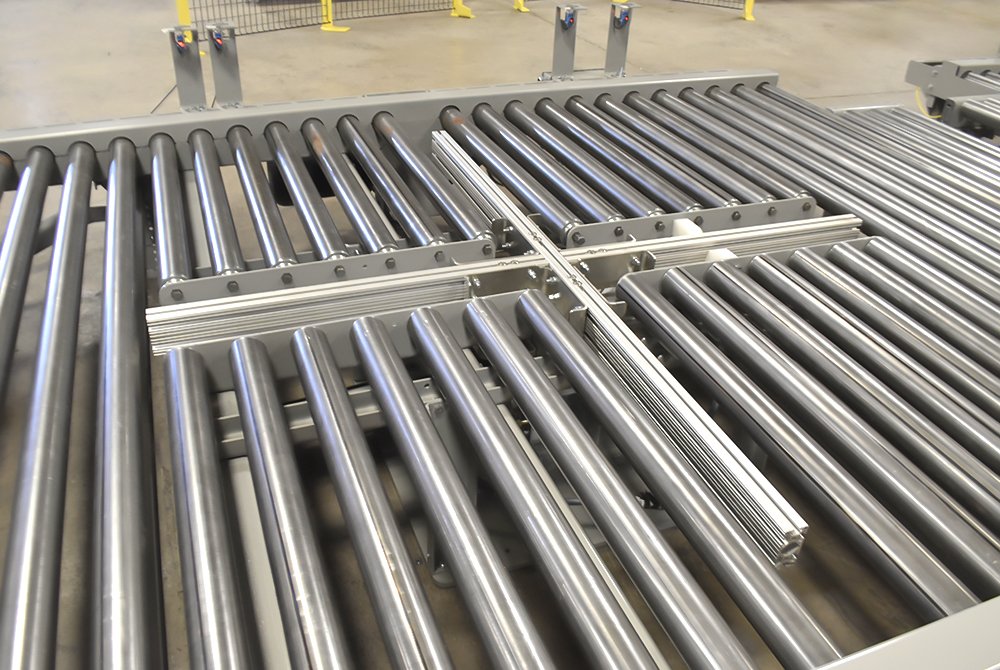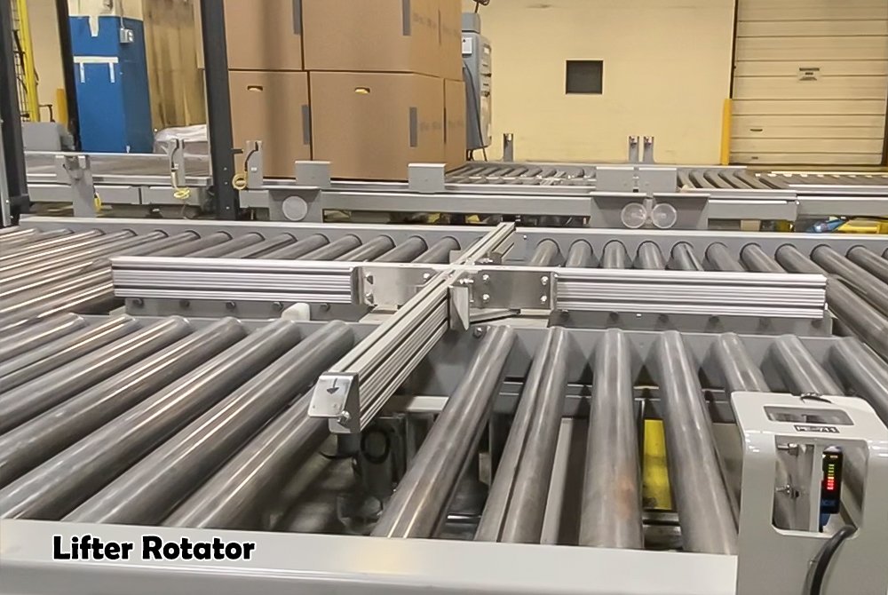 The Lifter Rotator for Dyco’s roller pallet conveyor assists in the re-orientation of loads or for easier removal by fork truck.