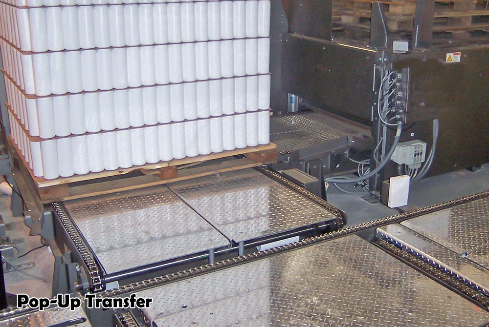 Dyco’s Pop-Up Transfer for its drag chain pallet conveyor simplifies the transferring of pallets from drag chain to roller conveyor or onto another section of drag chain conveyor.