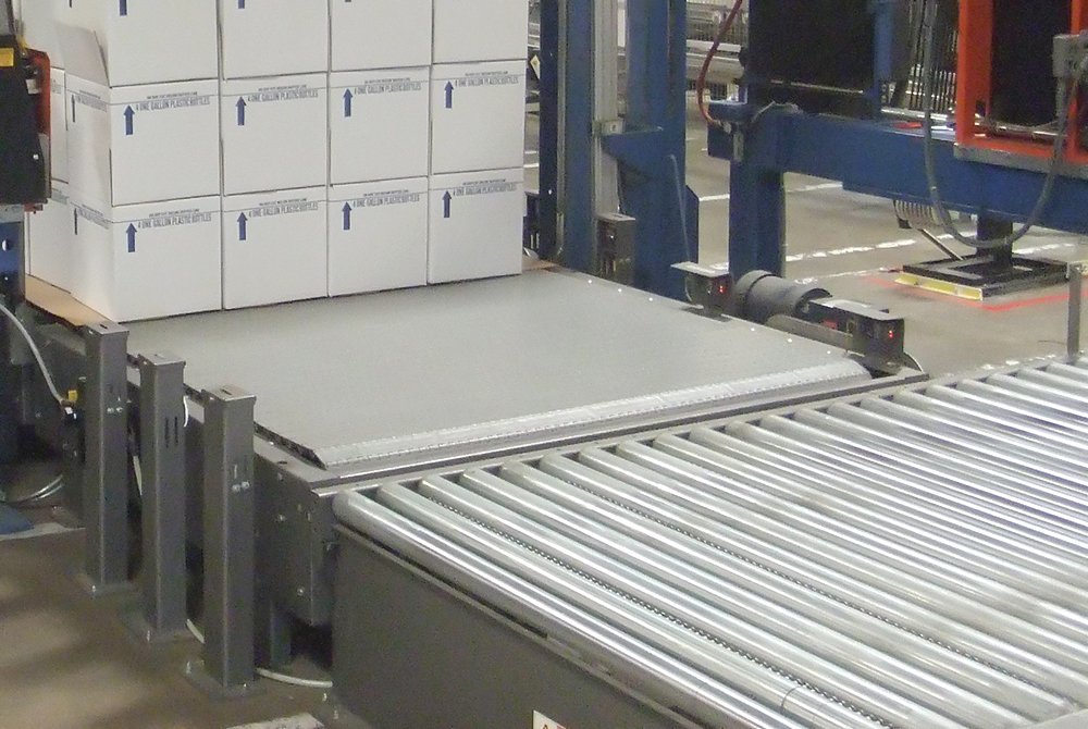 - Moves boxes into position for banding or stretch-wrapping after stacking or palletizing