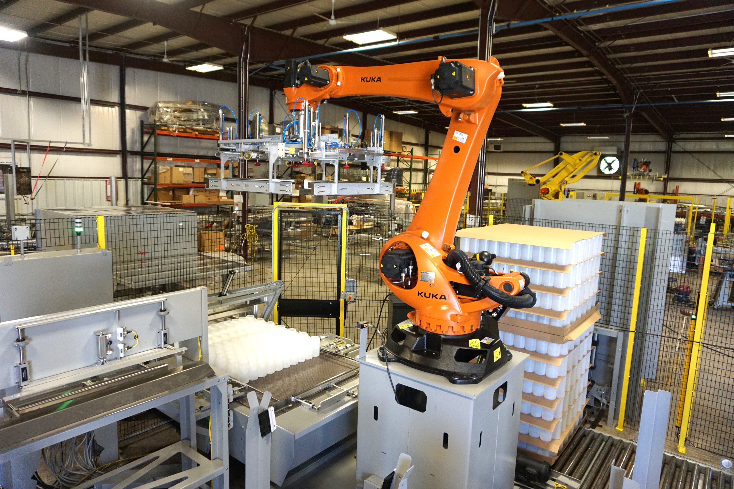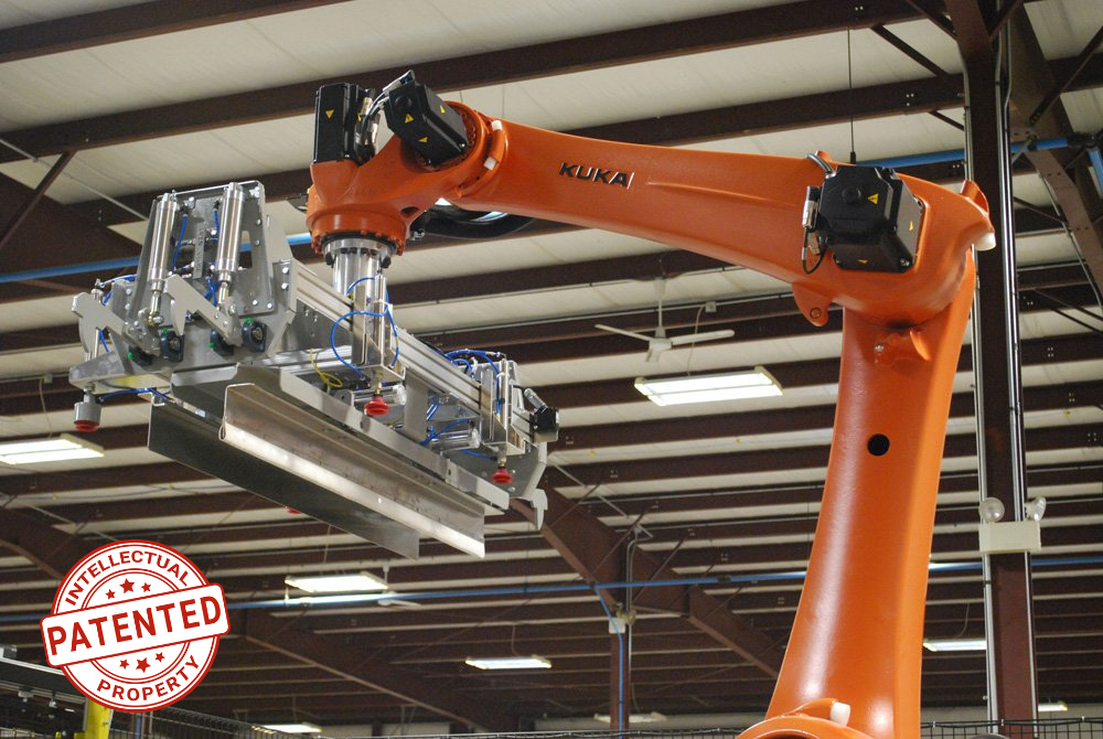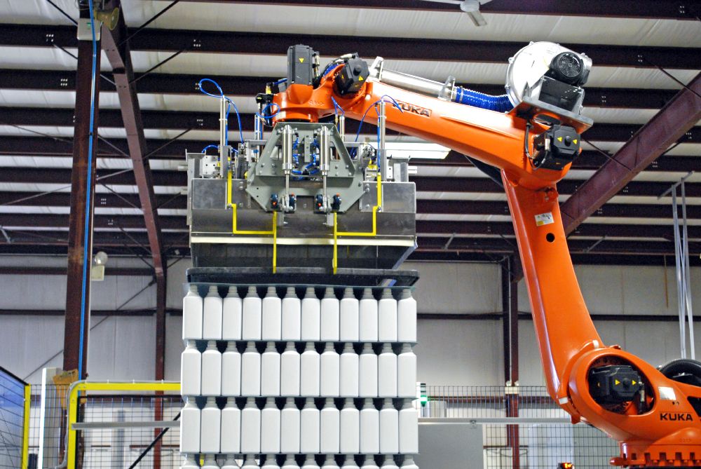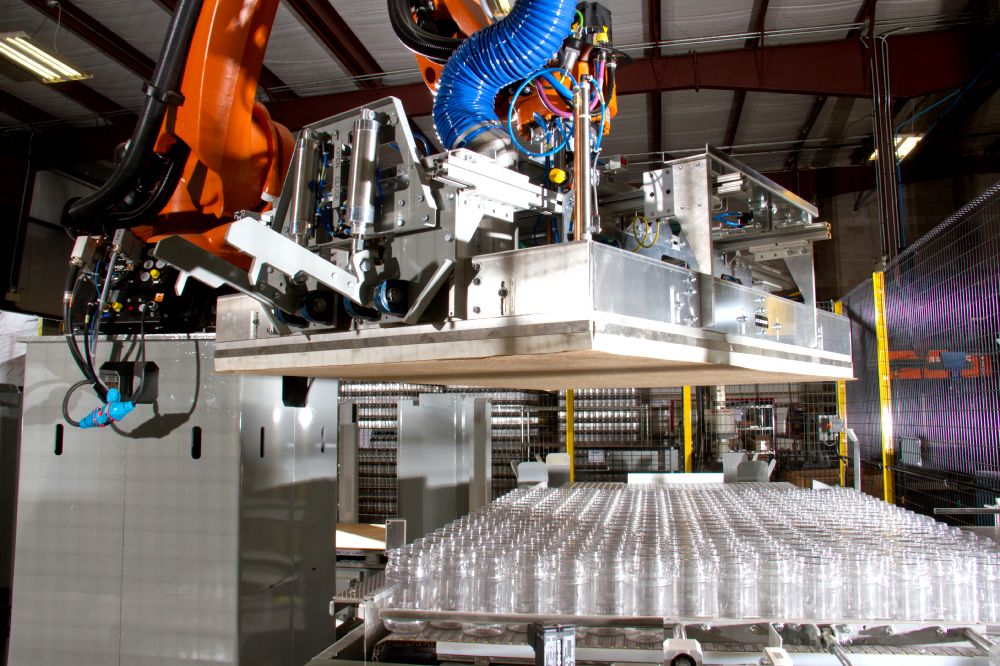Dyco’s Full-Array Compression Head Robotic Palletizing system is a cost-effective tool, ideal for lifting arrays of both square and round containers. Its low-level array building provides easy operator and maintenance access. Meanwhile, several options are available to help meet your budget and staffing needs.