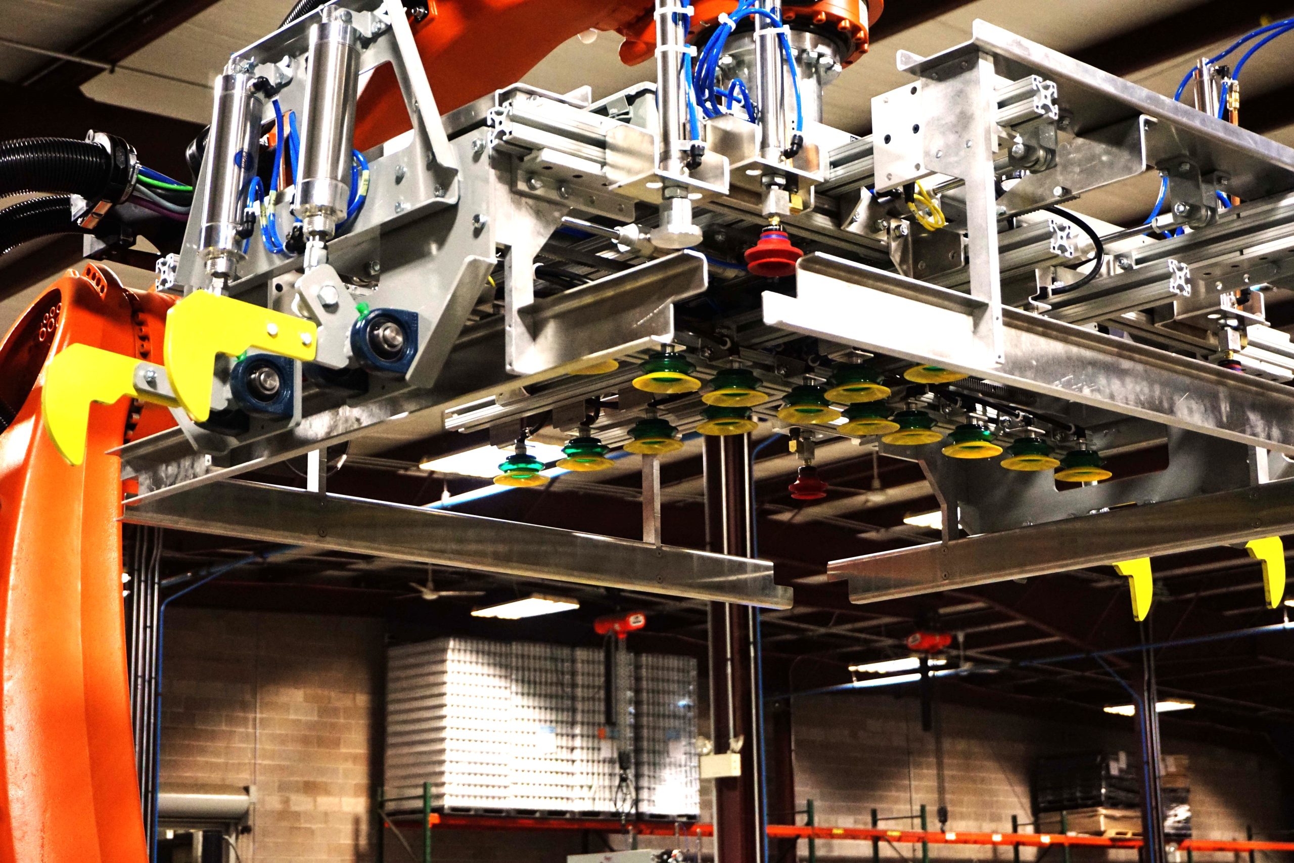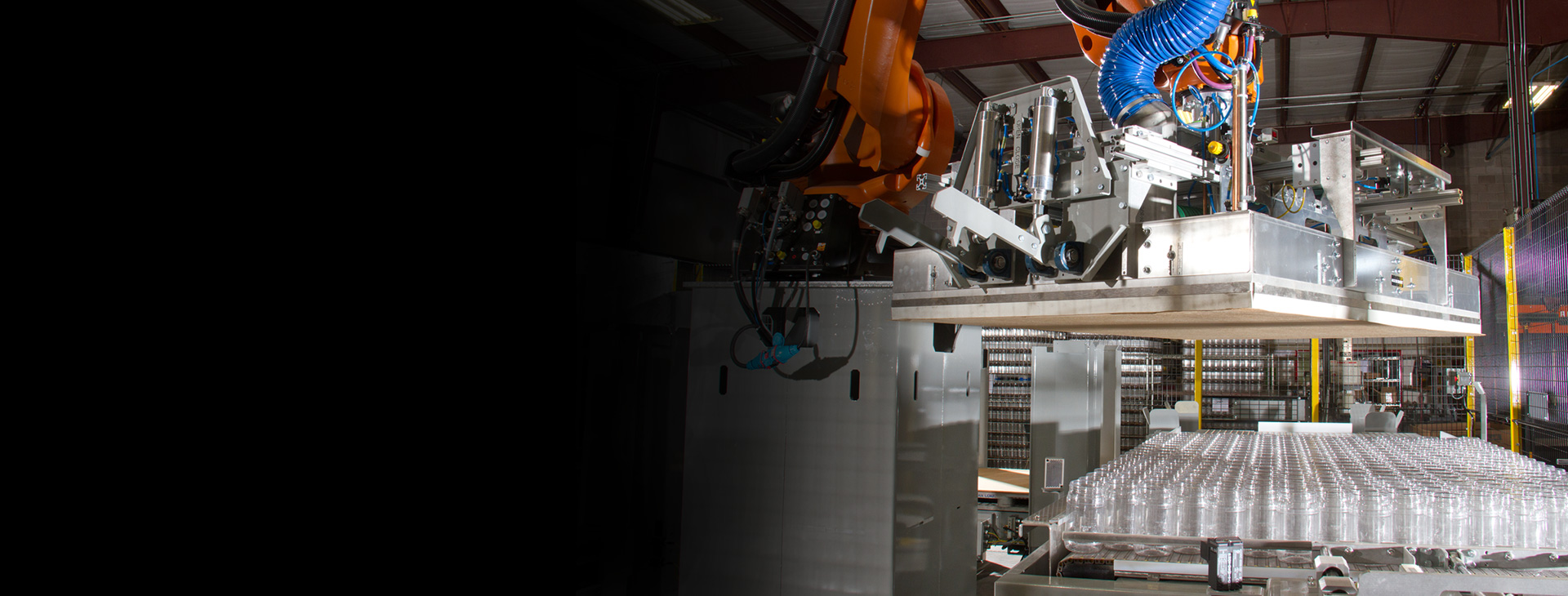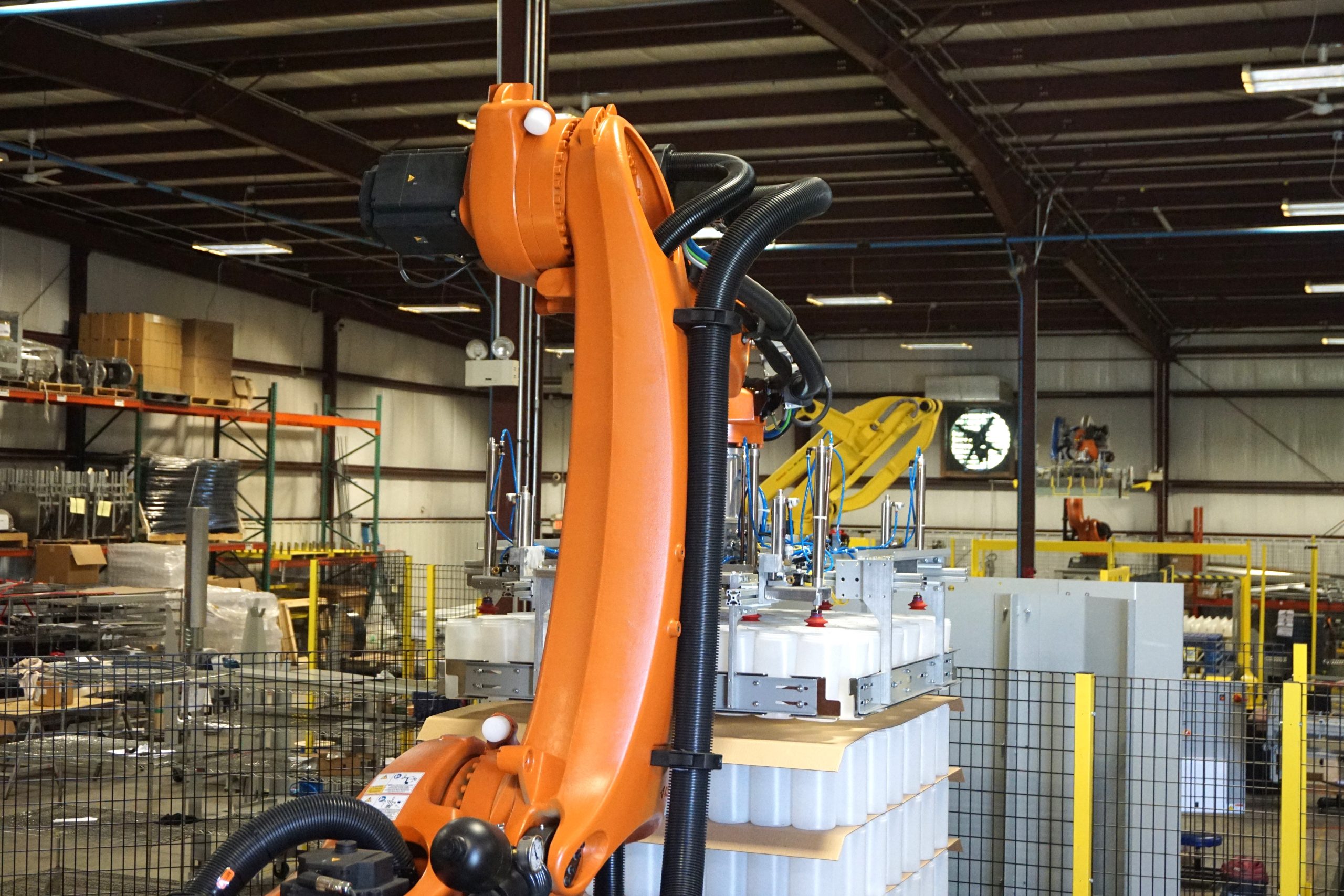 Dyco’s Full-Array Compression Head Robotic Palletizing system is a cost-effective tool, ideal for lifting arrays of both square and round containers. Its low-level array building provides easy operator and maintenance access. Meanwhile, several options are available to help meet your budget and staffing needs.