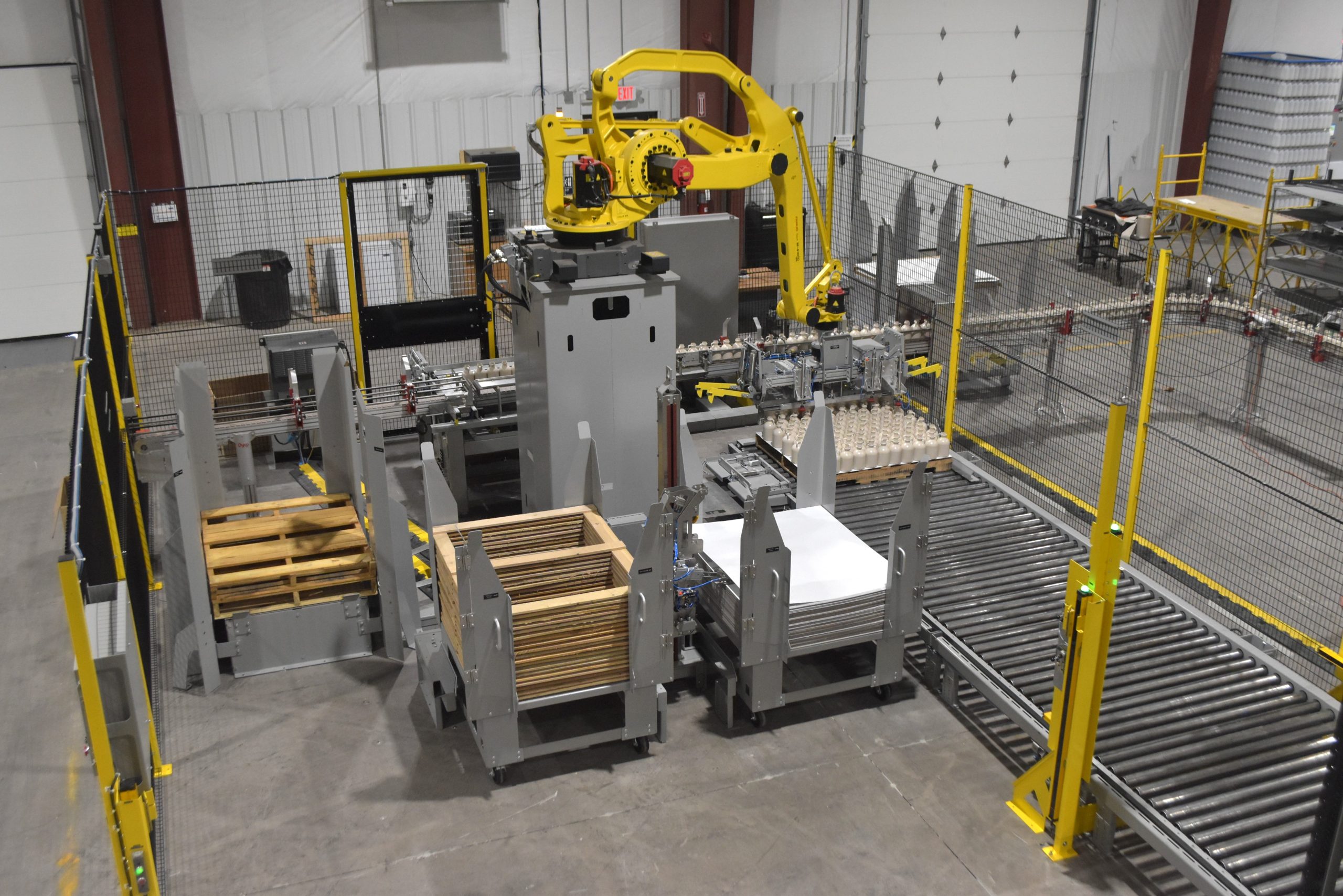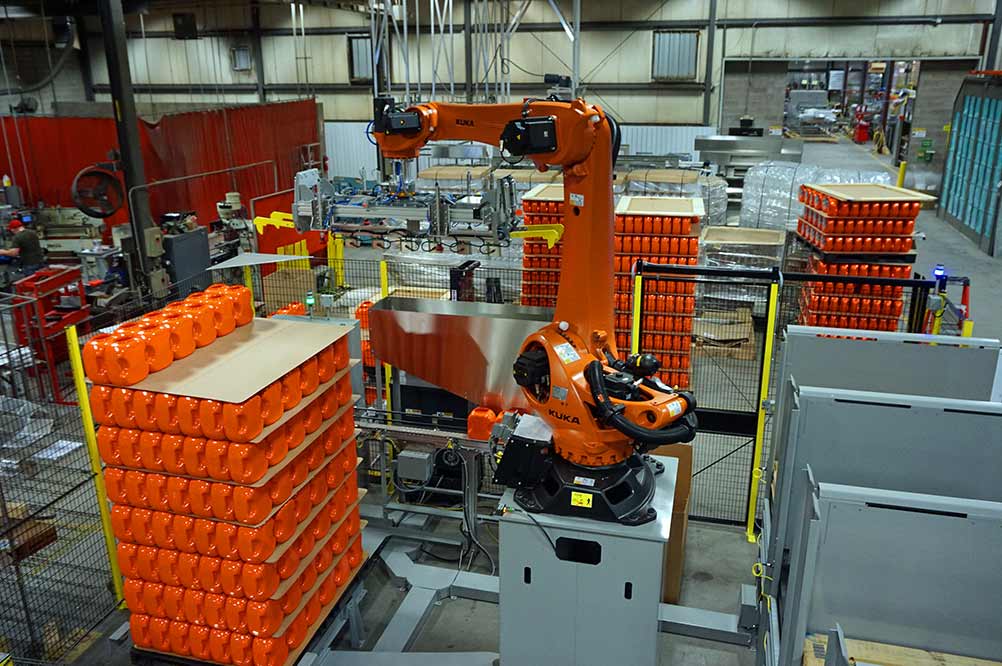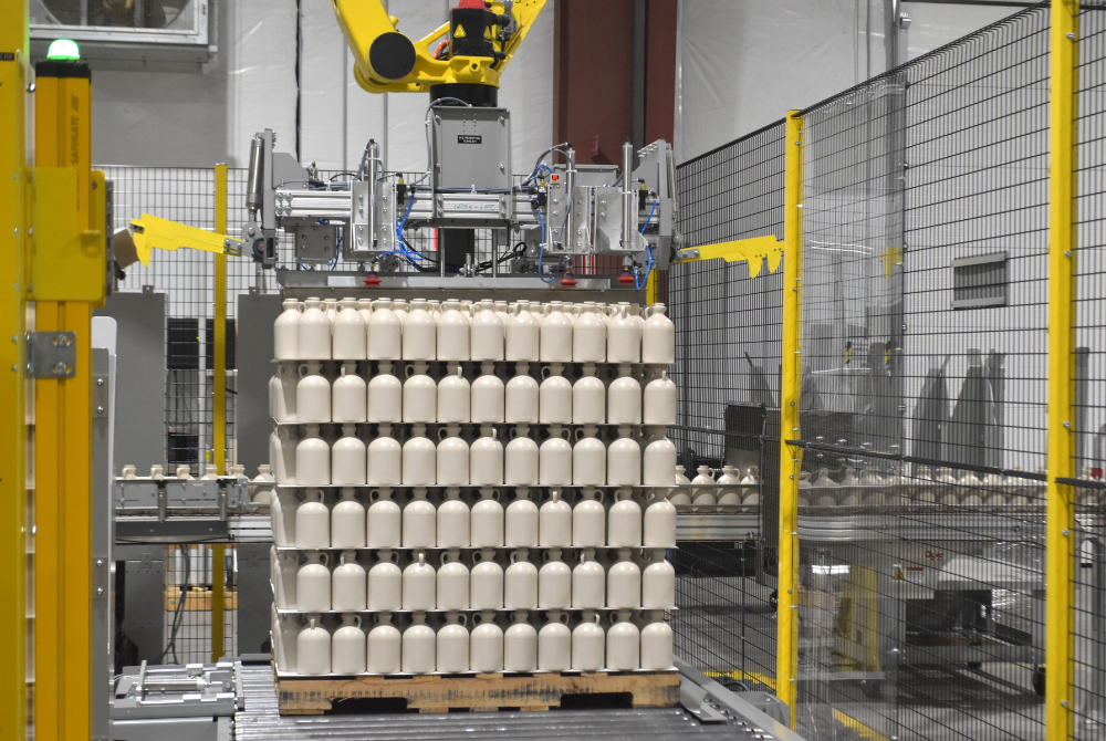 Dyco’s Single-Lane Automatic Palletizing solution offers head tooling to handle bottles, slip sheets, top frames, and pallets in one system. Precise robotic technology provides high accuracy of bottle placement and makes it a low-cost solution while offering the same benefits as other automatic palletizing equipment.
