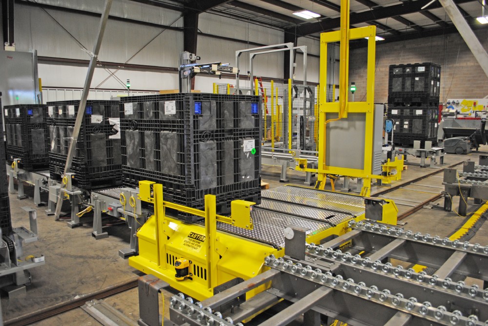 Dyco’s Pallet Transfer Carts for unit loads provides an economical and innovative means to shuttle palletized loads and has integrated and redundant safety sensors to provide a reliable and safe operation that does not interrupt product flow. Our transfer cart systems allow both operator and forklift access to palletizers or associated equipment while maintaining the system’s handling of unit loads between locations.