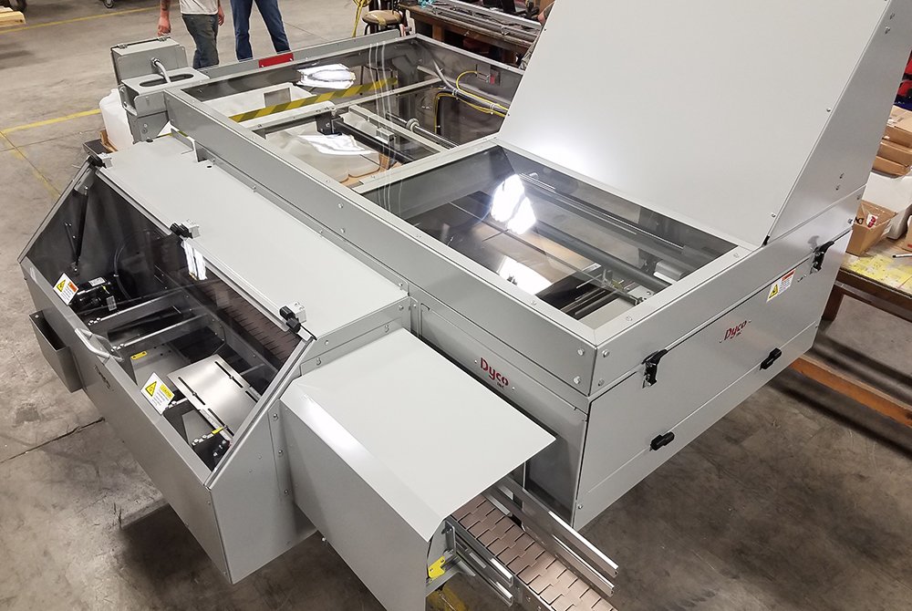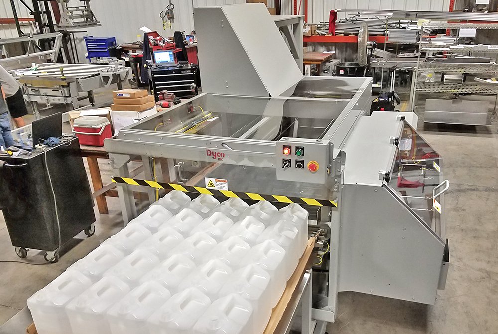 Dyco’s Semi-Automatic Tray Loading system, compatible with tab lock trays, automates the labor intensive parts of your operation. Bottles enter the packer from a table top conveyor infeed and the packer then forms the containers into rows and, finally, into an array. The array is then pushed directly onto a tray to make the tray ready for shipment.