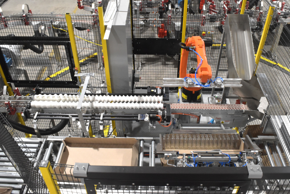 Dyco’s Tray Loading system for molded trays is fully automatic, delivering efficient and rapid loading of diverse bottle-and-tray combinations in one streamlined system. Our quick-change end-of-arm tooling ensures adaptability to various molded tray configurations and sizes.