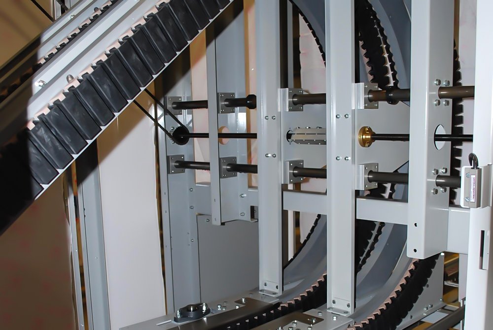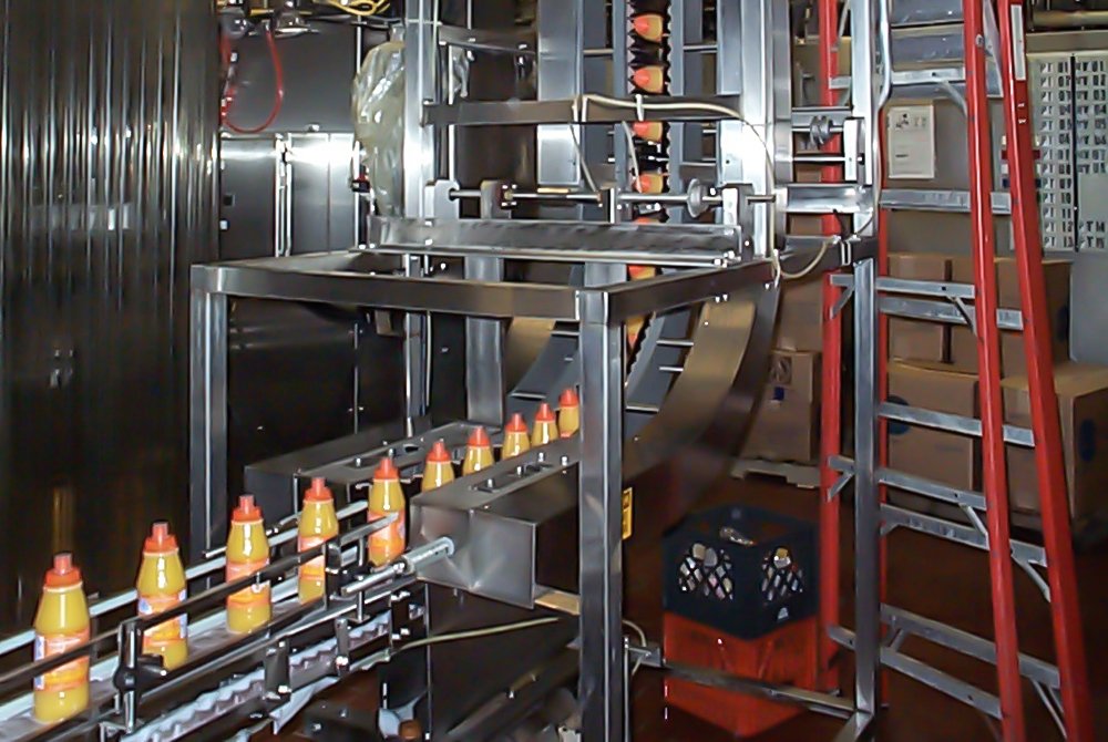 Dyco’s Side-Grip Elevator and Lowerator changes elevation in your conveying system within a small footprint. The soft texture gripper chain ensures no bottle damage while the side-grip is strong enough to handle fully packaged products, such as squat packs of containers. Dyco’s system provides easy-to-maintain bottle orientation and a greater flow of products that traditional elevating machines.