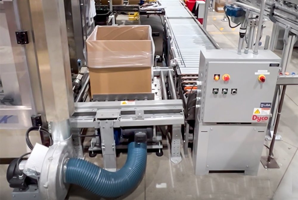 Dyco’s Air Evacuation Unit uses a vacuum blower to tighten a plastic liner to the sides of the box, creating additional protection against outside contaminants. Inline, stand-alone, and integrated pusher versions of our air evacuation units work well with our box conveyor systems.