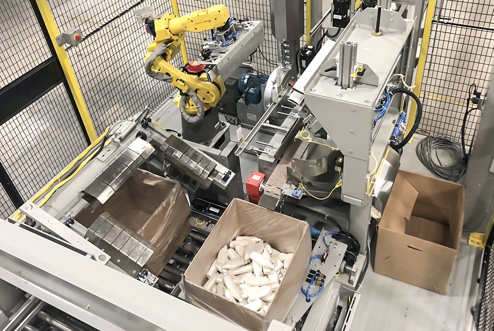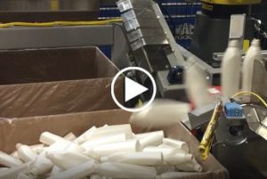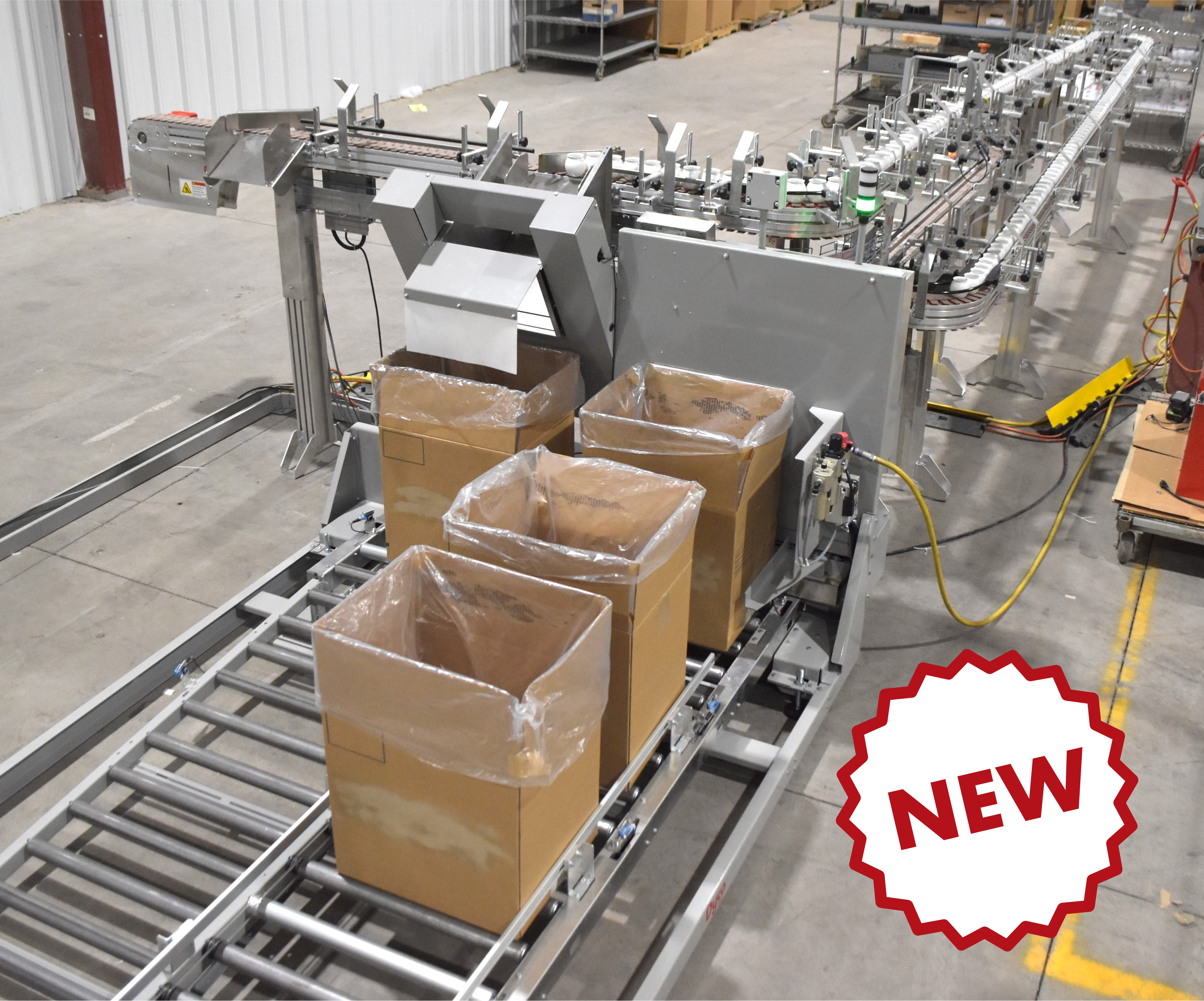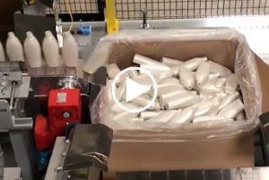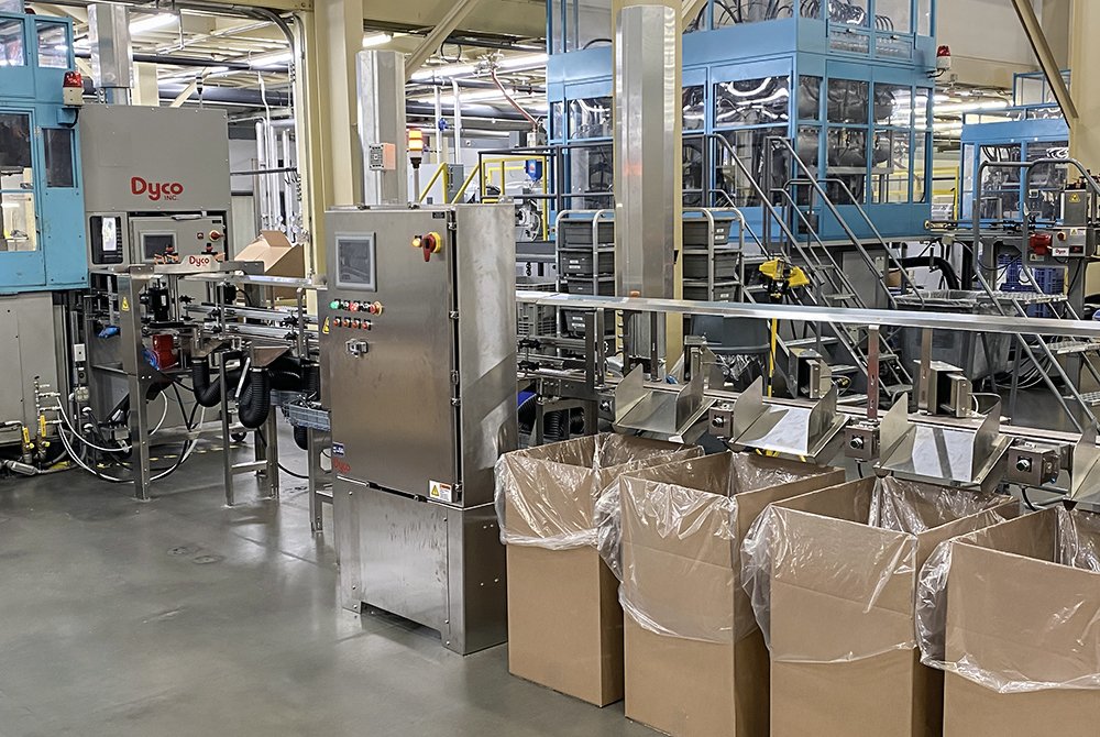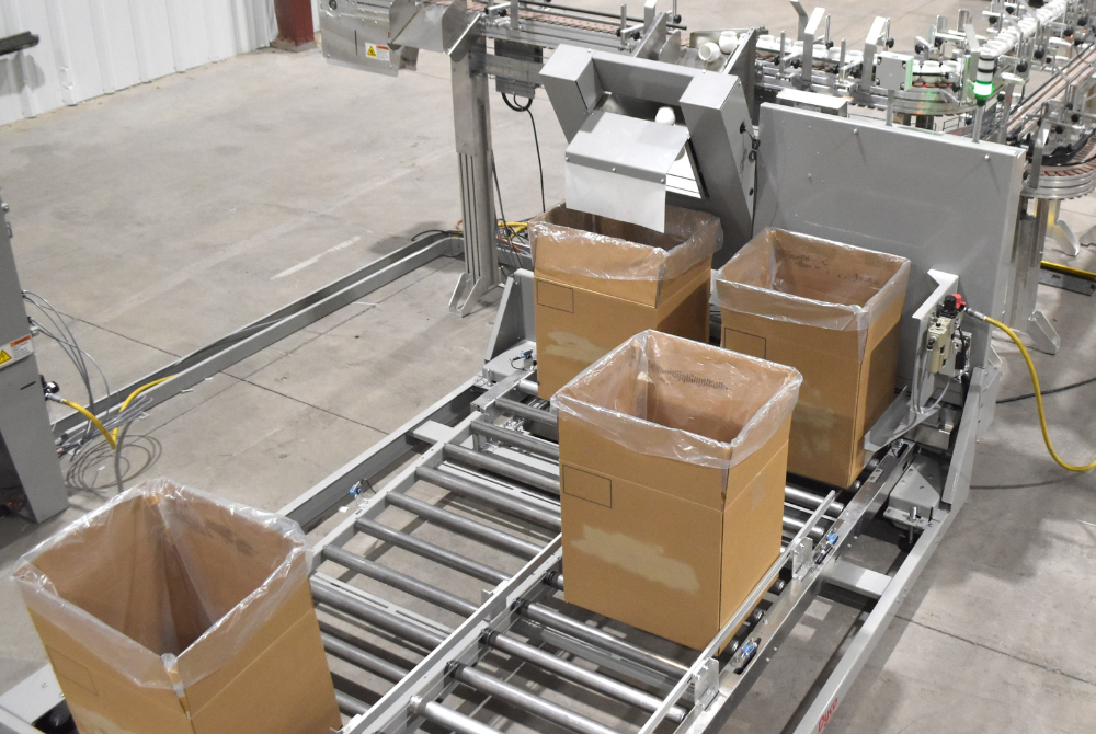 Dyco’s tumble pack box loading with indexing boxes readily sorts bottles into boxes using one gate while moving the boxes, along a conveyor, into place for loading. The system comes available as a straight through or as a U-shape, allowing for loading and unloading boxes in a single location.