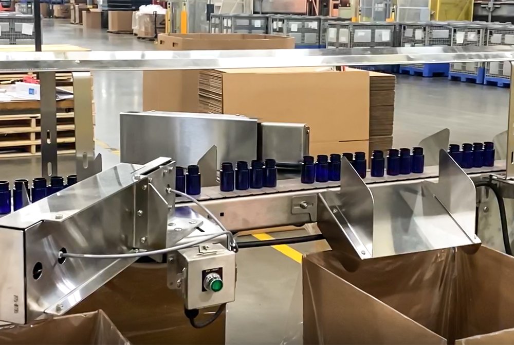 Dyco’s tumble pack box loading with multiple gates readily sorts bottles into boxes based on an operator-controlled count. The multiple gating system allows for multiple box loading stations and enables operators to perform other tasks during the box loading process.