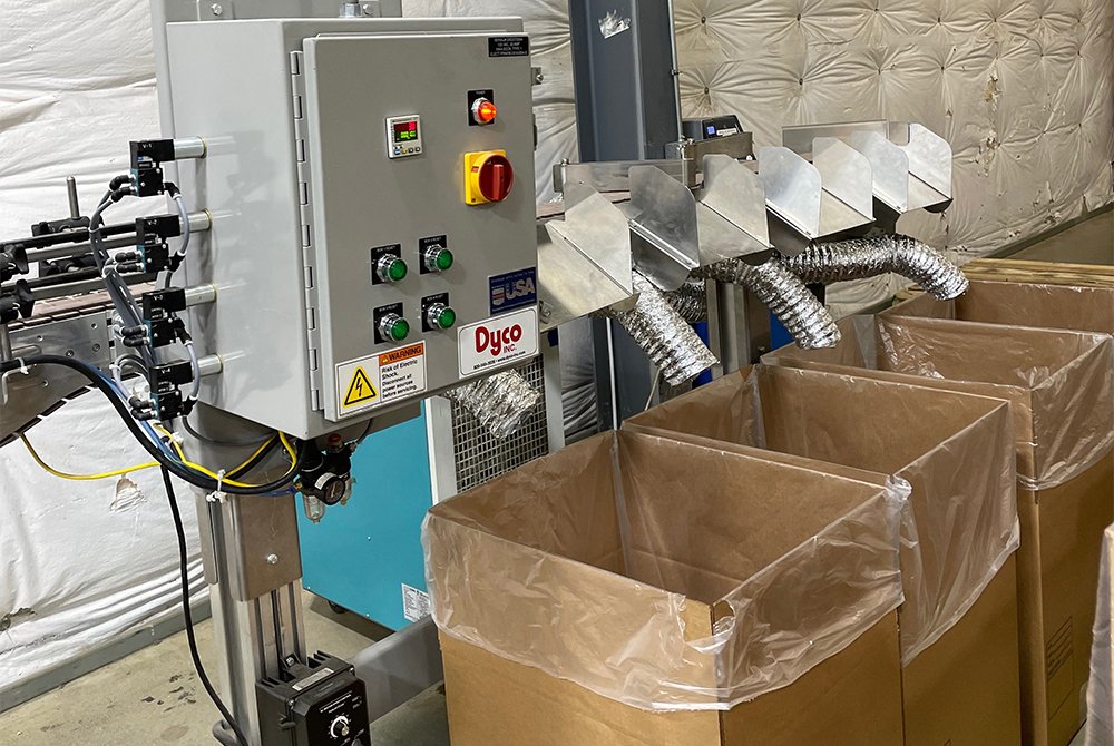 Dyco’s “weight-based” tumble pack box loading system loads boxes until the selected weight is reached. These are available in straight through or U shape configurations to optimize the space available. These systems can be easily be moved around using optional casters or via forklift.