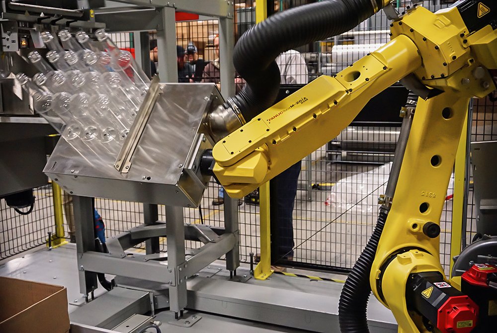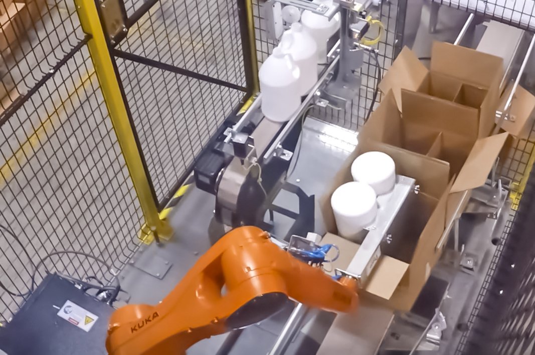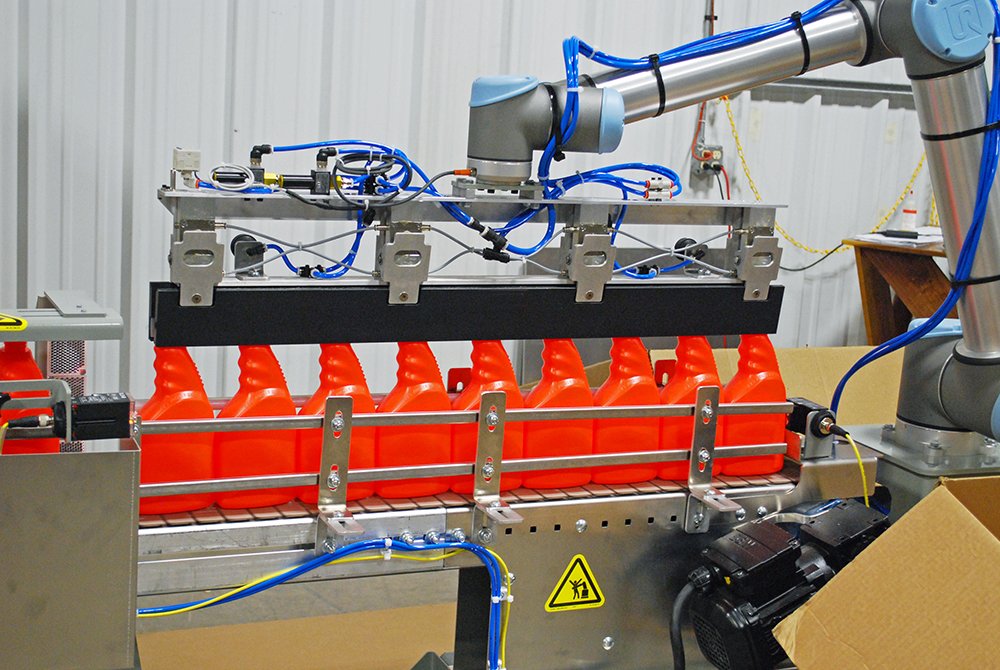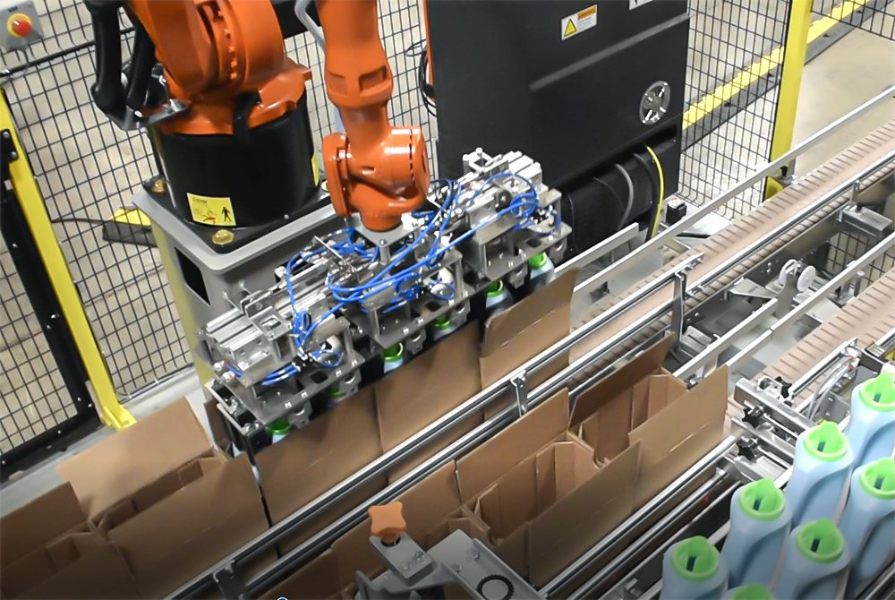 Decrease labor costs and increase throughput as compared to manual box loading with Dyco’s Single-Row RSC Box Loading system. Also compatible with inserts, our integrated robotic arm allows for precise bottle pick-up and placement into regular slotted container boxes. Meanwhile, our quick change tool head allows for changeovers in under a minute.