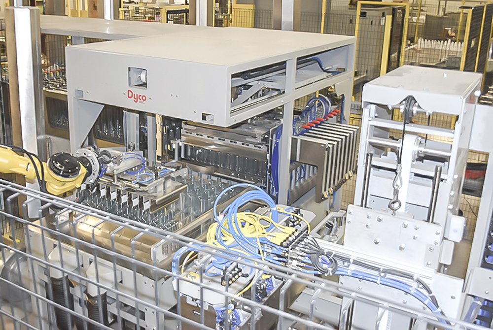 Dyco’s Dual-Row RSC Box Loading systems provide precise bottle pick-up and placement into regular slotted containers. We offer multiple options including a dual-row system and a dual-row and dual-lane solution – both of which come available with partition inserting.