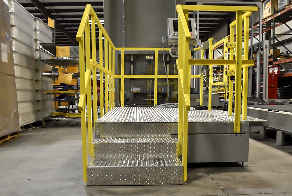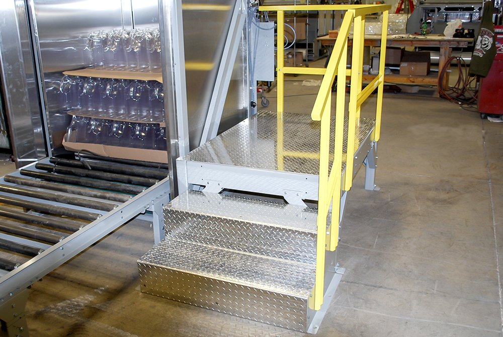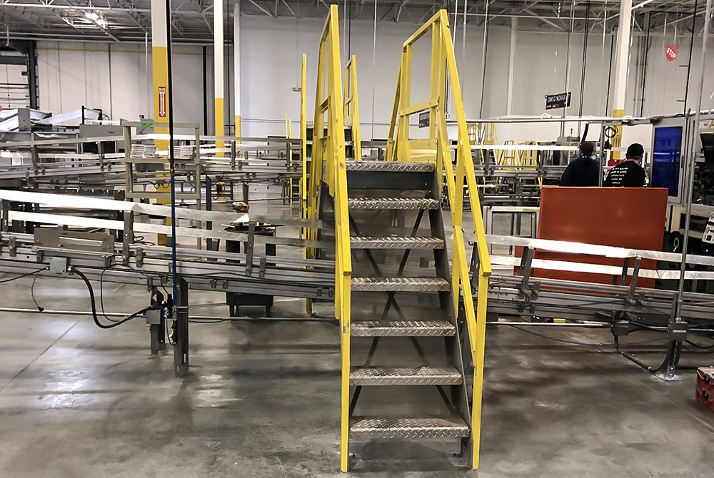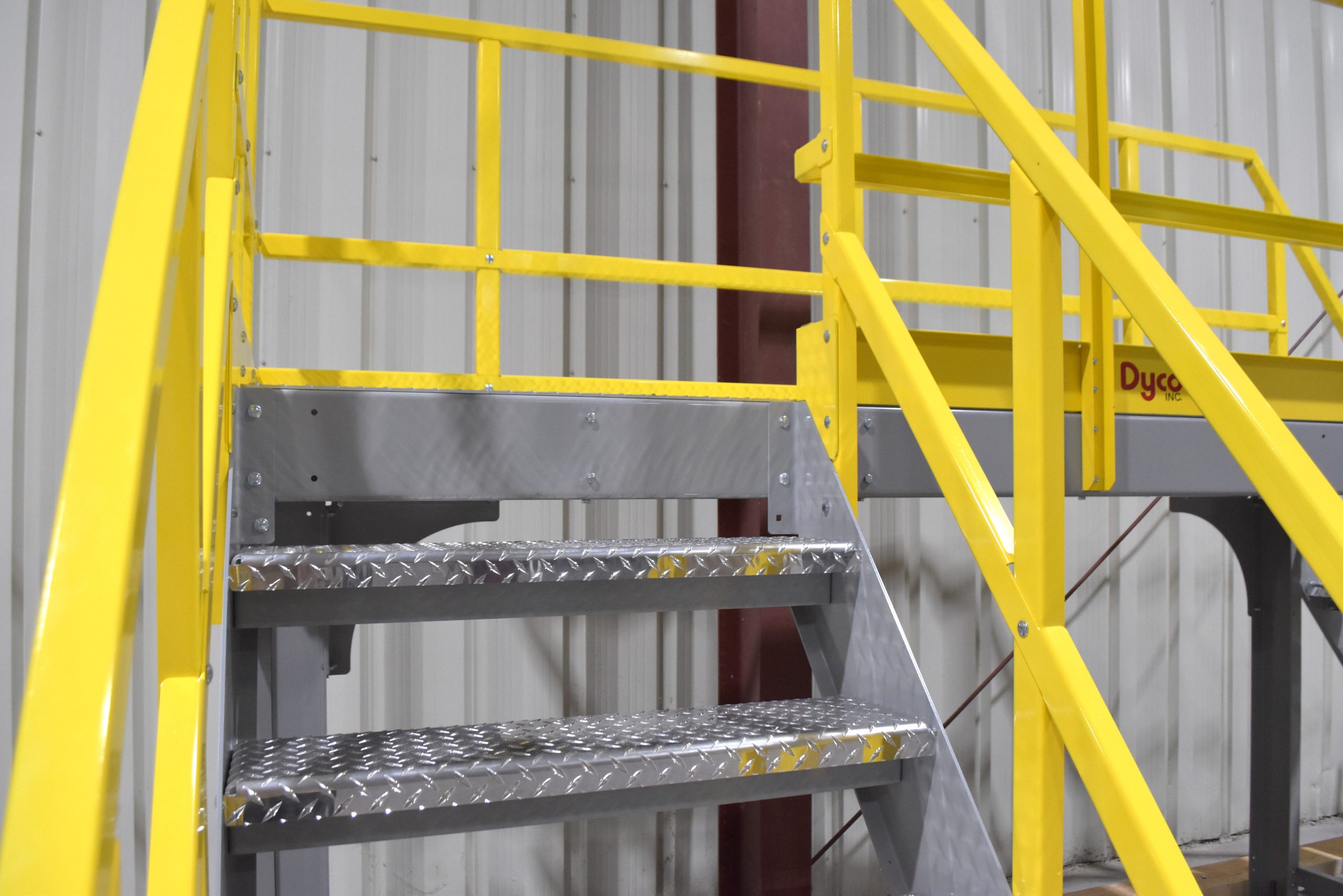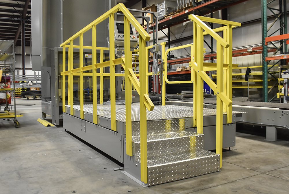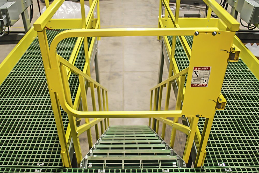 Dyco’s Crossover Stairs provides operators and maintenance access to equipment, reduces human movement in congested fork truck paths, and eliminates the need for conveyor ducking or hopping. The stairs are constructed with diamond plating which allows for excellent slip resistance. The diamond plating design also eliminates the chance of debris falling through and contaminating or damaging the product underneath.