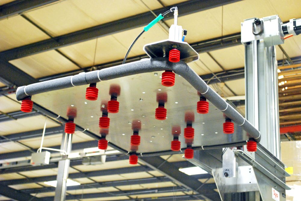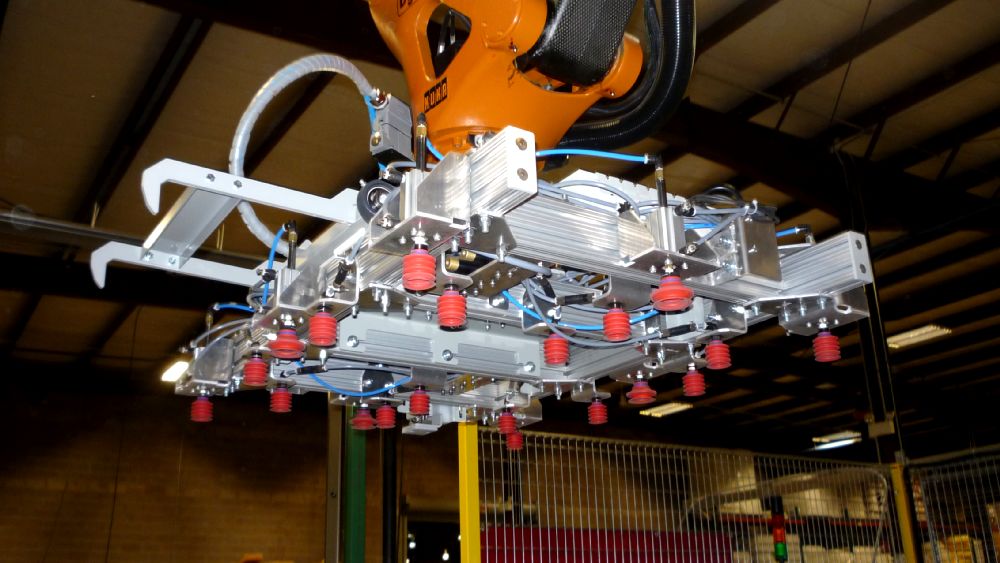 - Robotic head is designed to handle bottle, slip sheets, top covers, and pallets without changing tooling