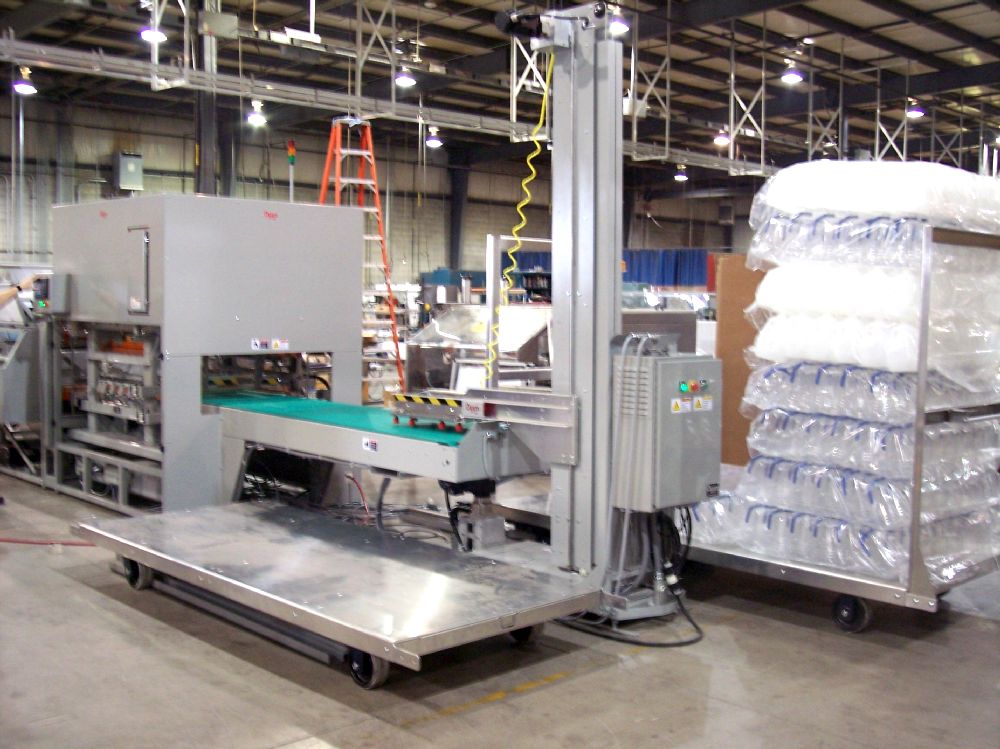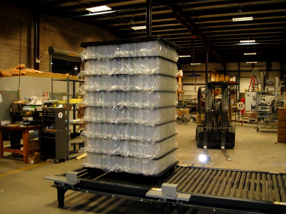 Add the Cart Indexing option to your Rotary Bagged Bottle Palletizing system for added accumulation. The cart indexes as each stack is complete, so you can stack up to three bundles. This provides additional time for an operator to perform other tasks and, therefore, reduces transportation time to your warehouse or truck loading.