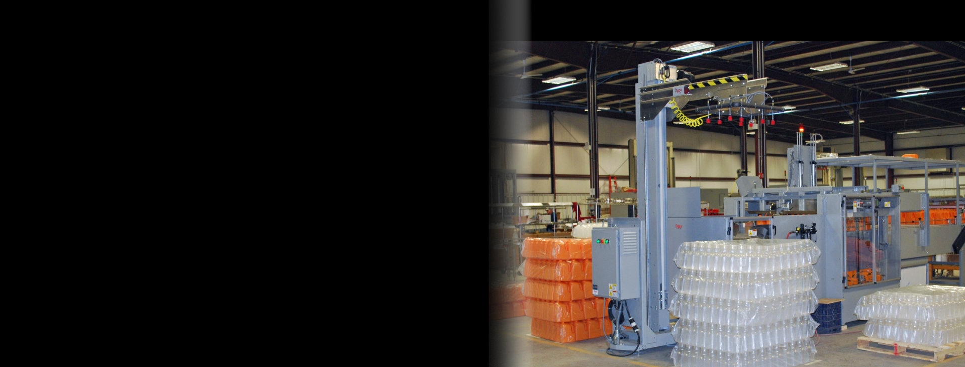 The Dyco Robotic Bagged Bottle Palletizer was developed to stack bags of empty bottles, produced by a Dyco Autobagger, to prepare for shipment or storage. Unlike the Rotary Bagged Bottle Palletizing system, this machine can palletize multiple bundles per layer, therefore maximizing pallet capacity. The system can also handle multiple lines simultaneously, even with different products running.
