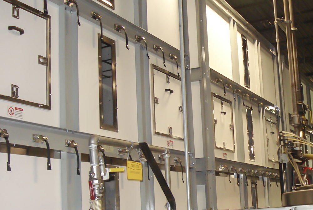 - Access panels and viewing ports allow monitoring of bottles as they are loaded and unloaded