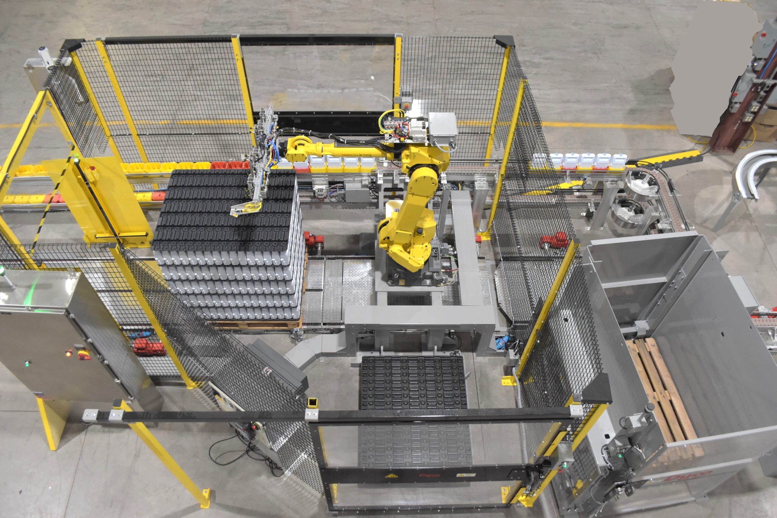 Dyco’s Automatic Tray Unloading system efficiently removes bottles of various shapes and sizes from fold-flap or molded trays. The quick-change end-of-arm tooling and user-friendly HMI makes our solution highly adaptable to various bottle and tray configurations. Containers can be placed in your preferred destination to optimize your line operations.
